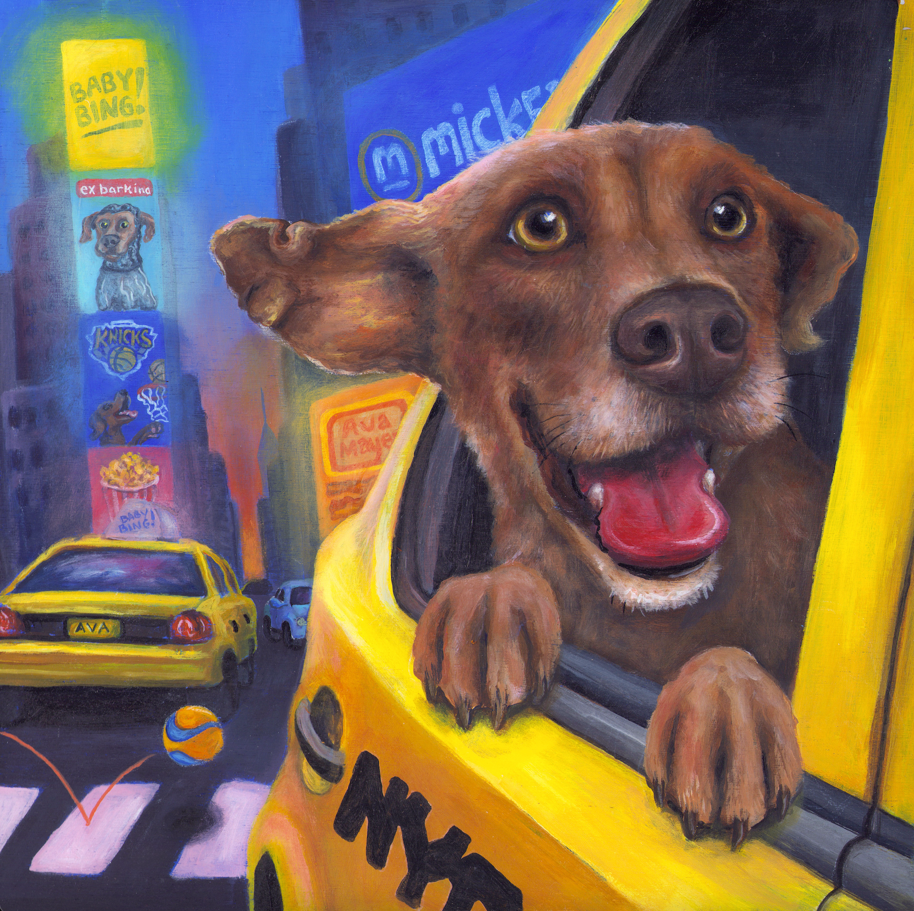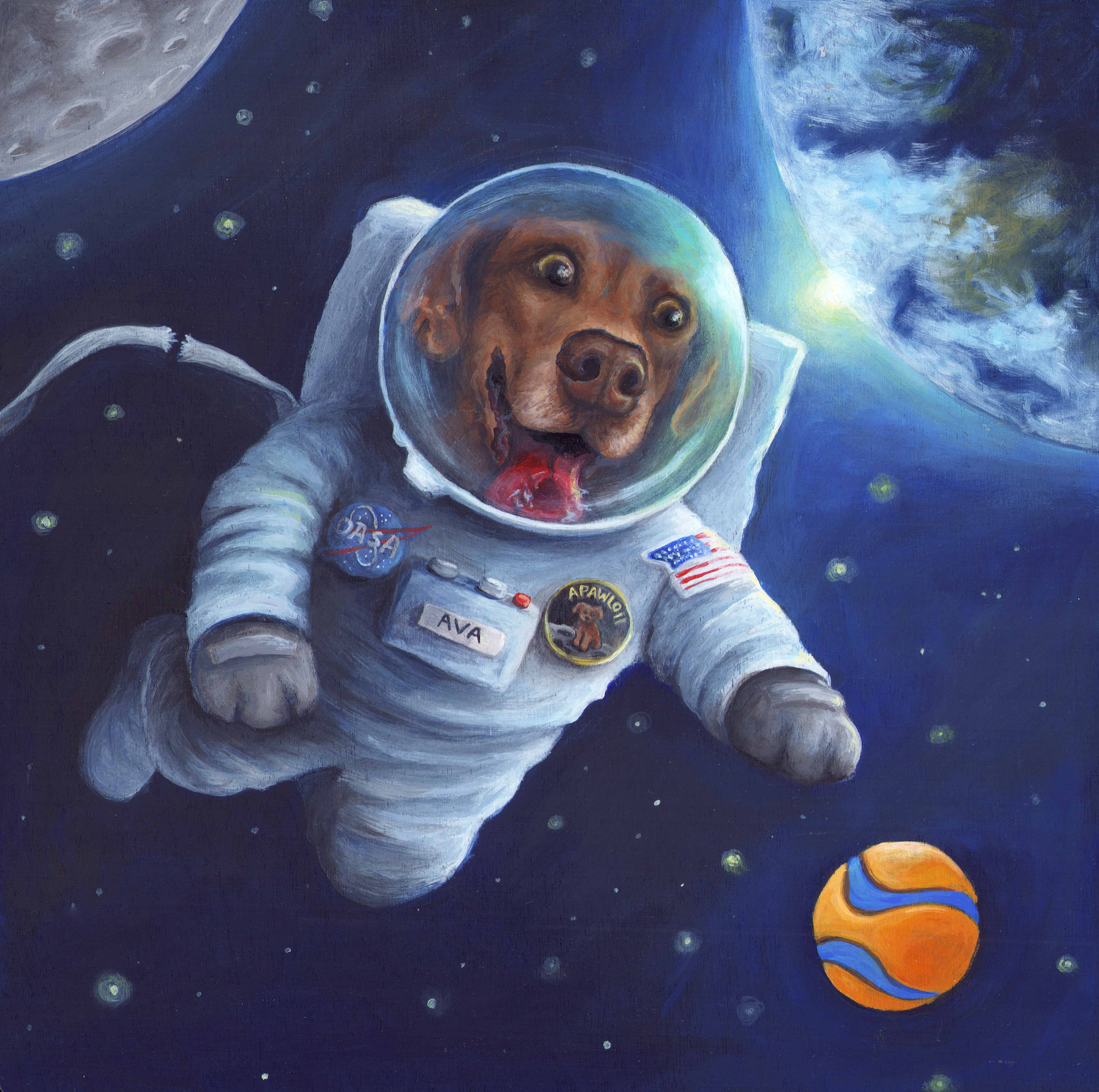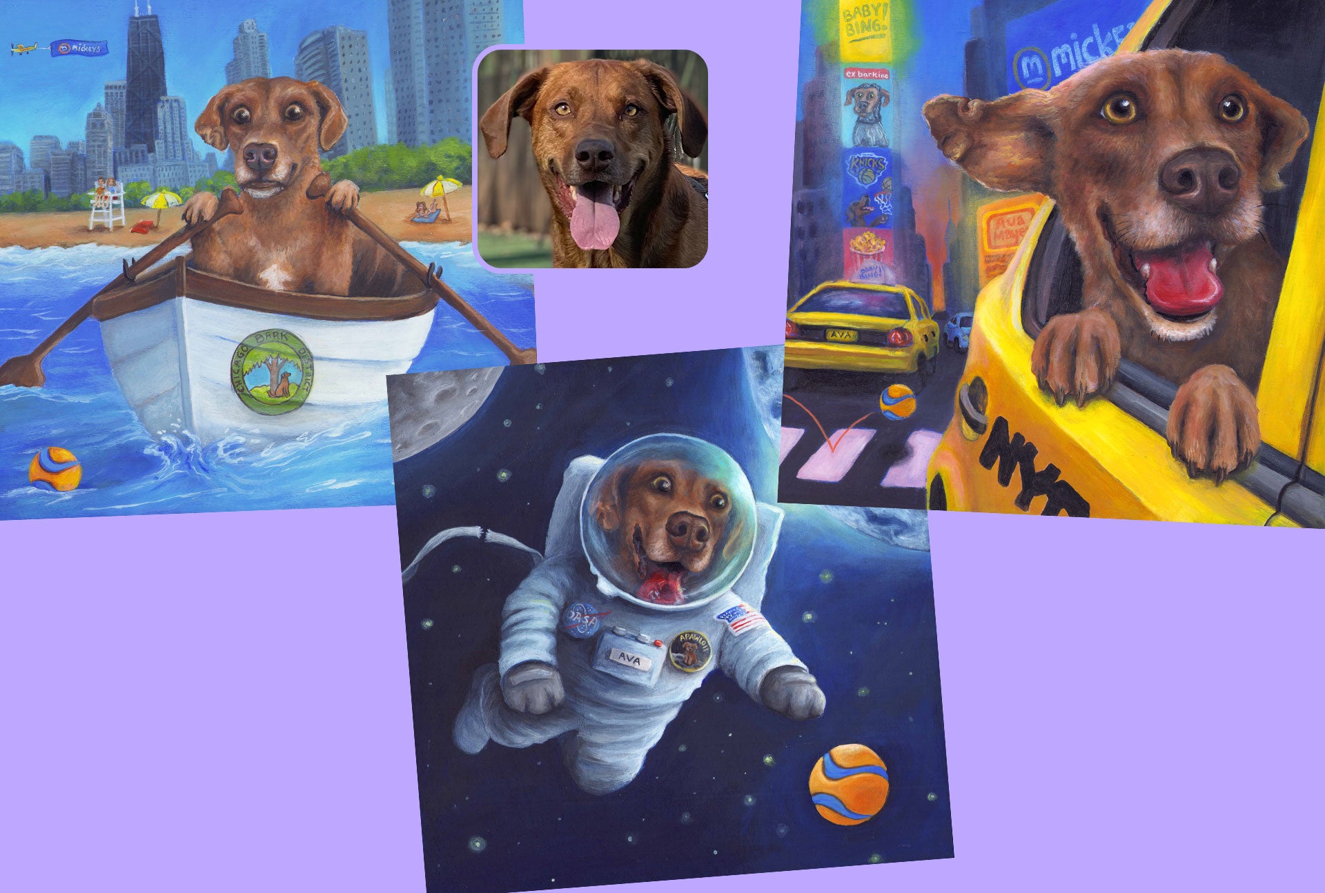 The clients and I brainstormed three scenes that had Ava traveling far and wide to fetch her beloved ball, in locations that are sentimental to them.