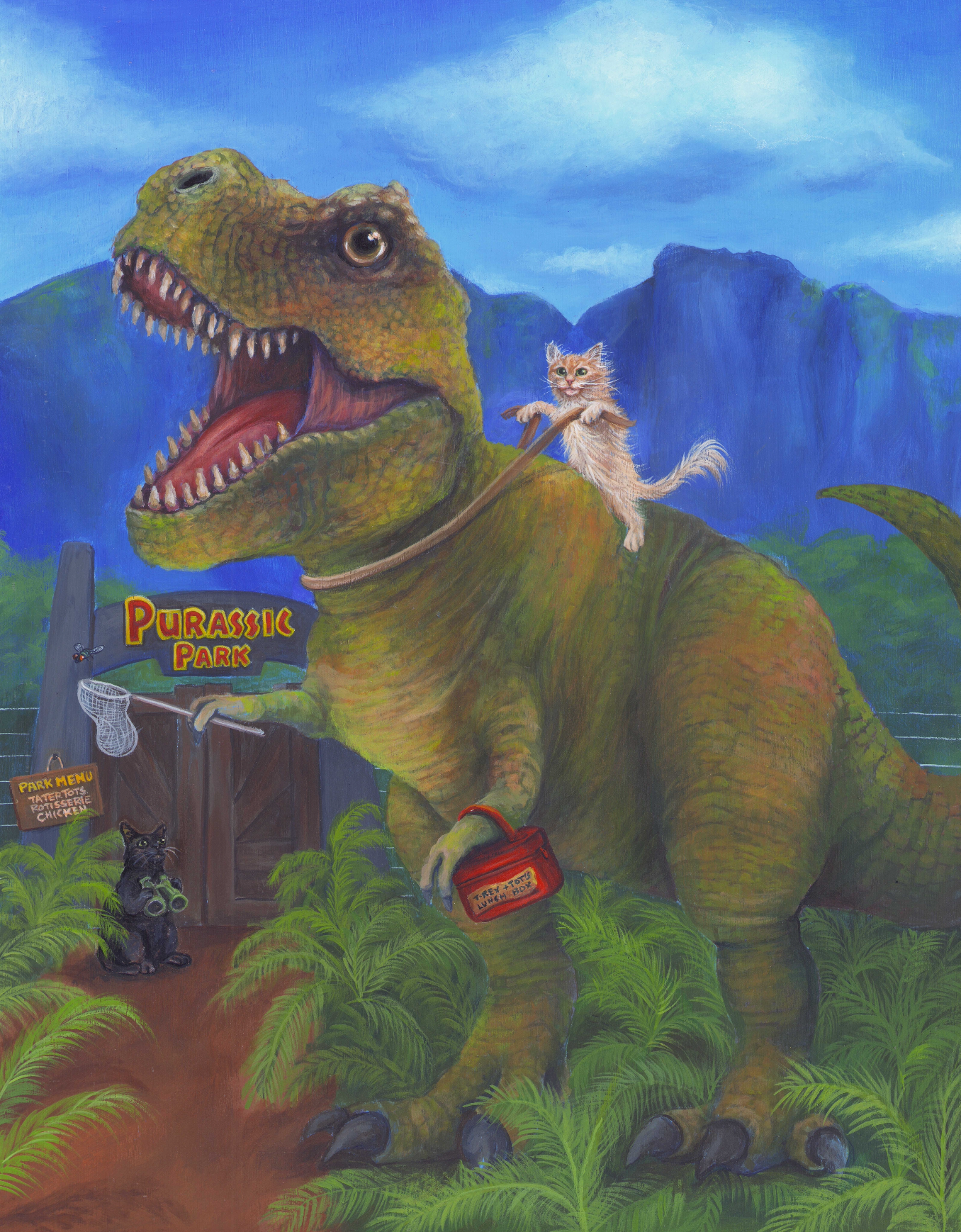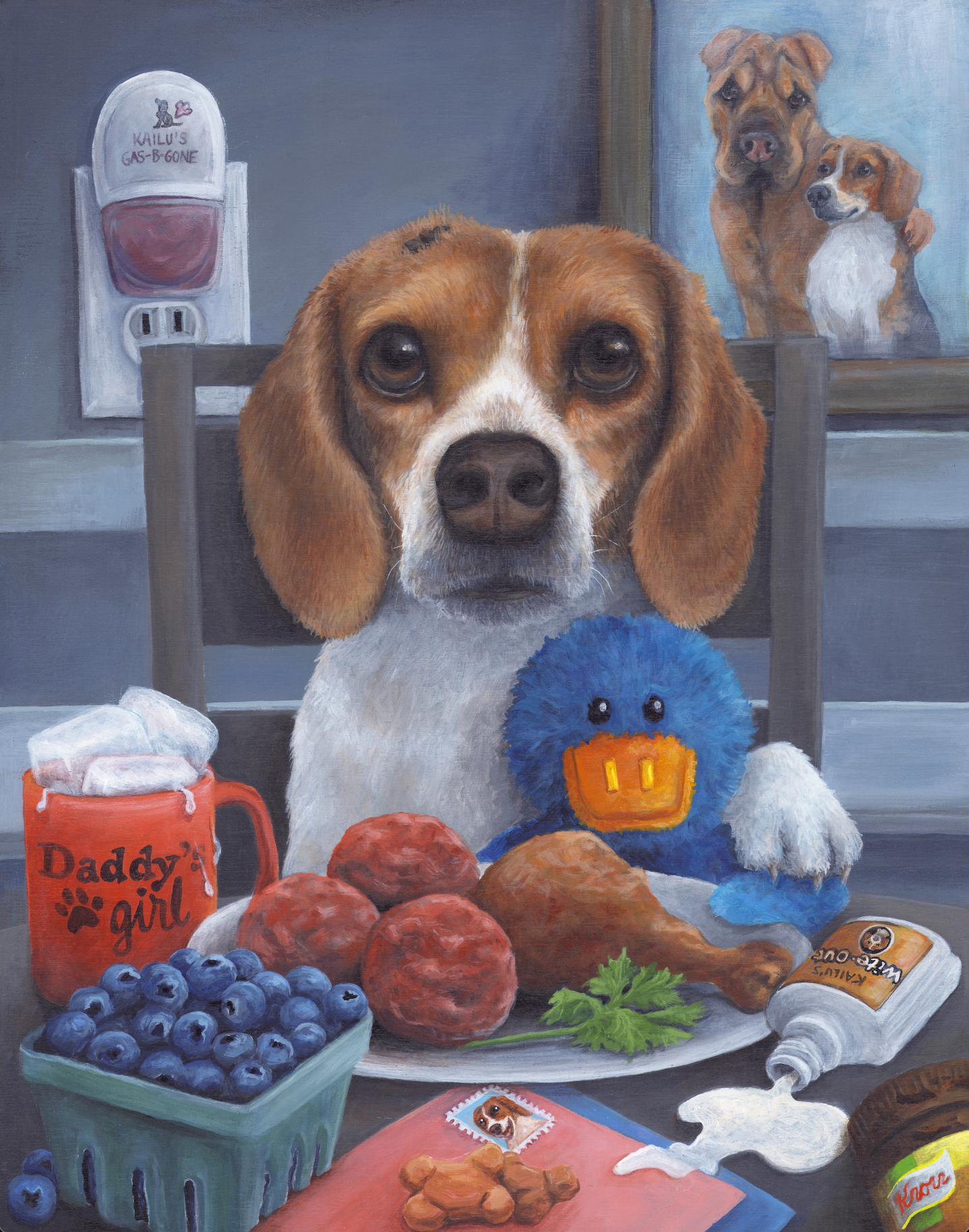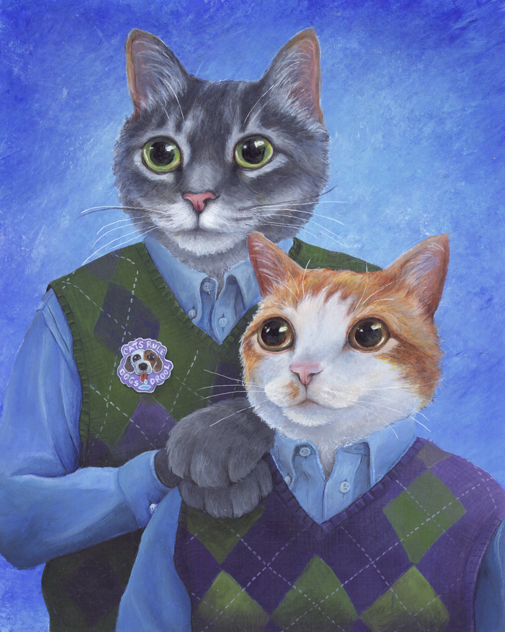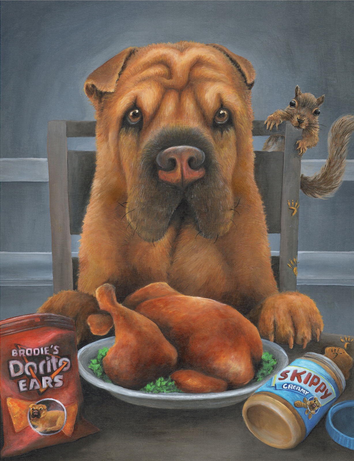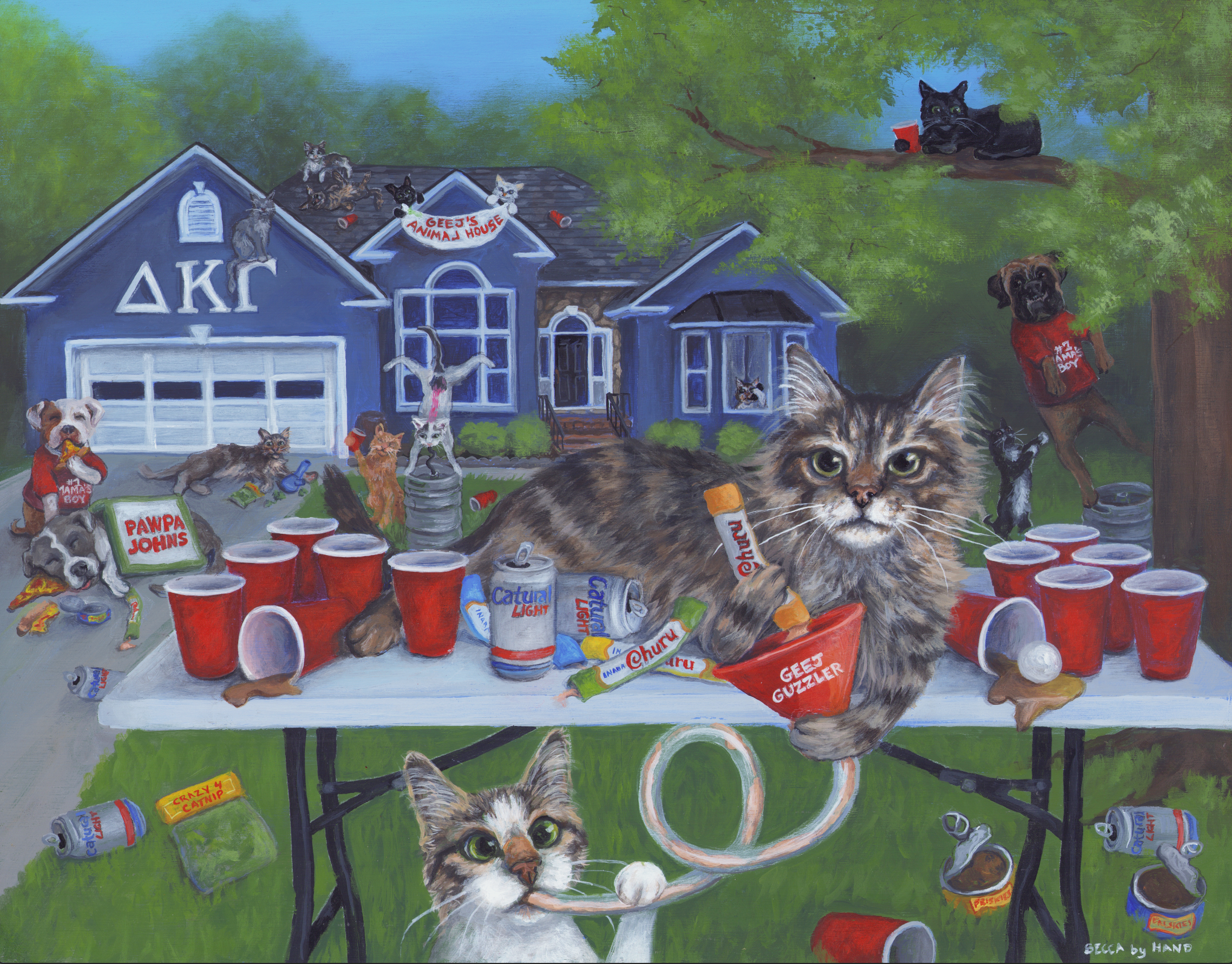 I specialize in ‘creative commissions’ of your furry friends. Whether depicted as pop culture characters or immortalized in sentimental scenes, I paint pets in ways that bring who they are and what you love to life. Humor and heart are at the core of everything I create — to encapsulate the immeasurable joy animals bring to our lives.