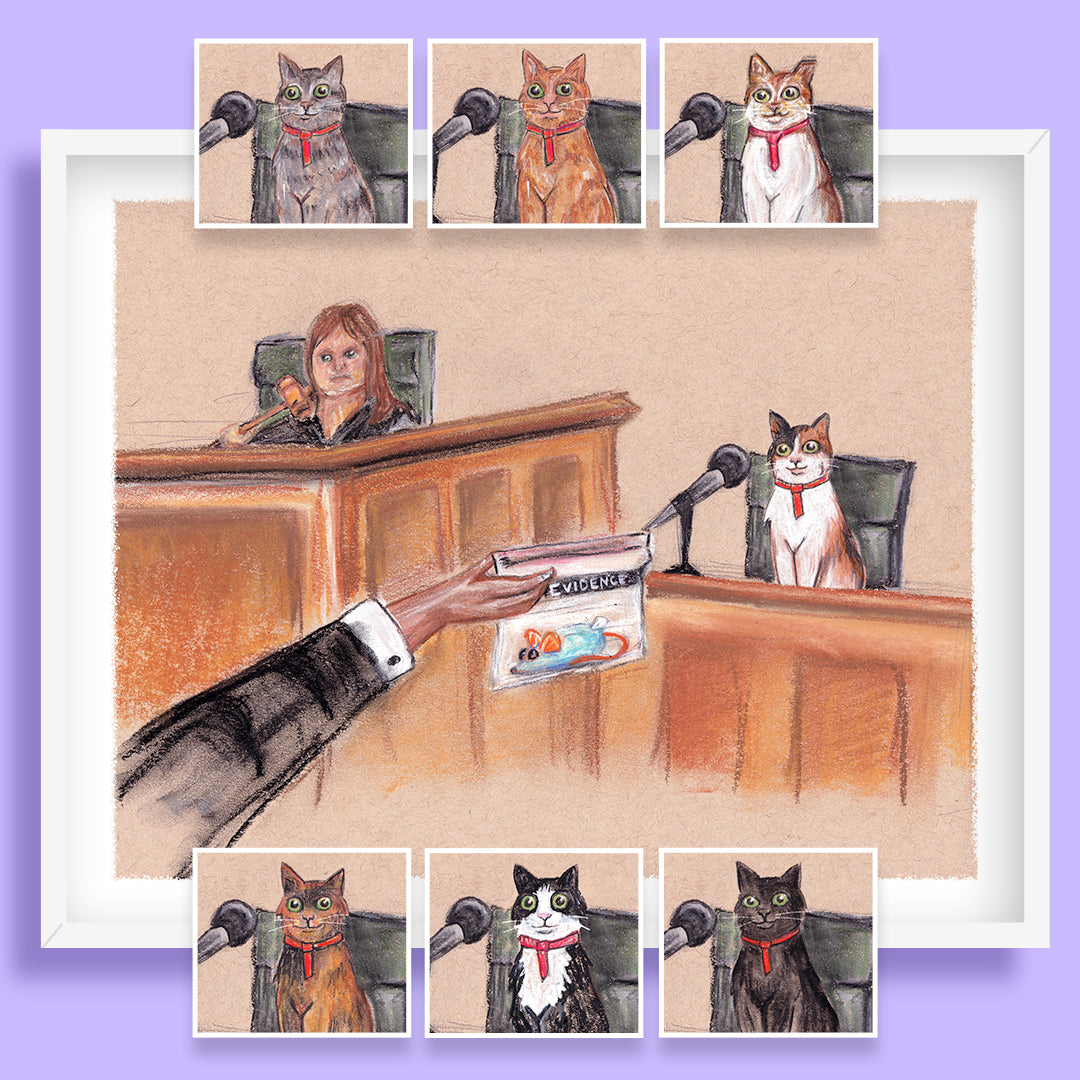 The print is customizable to the cat colors shown. Choose which cat you'd like to be put on trial ;)