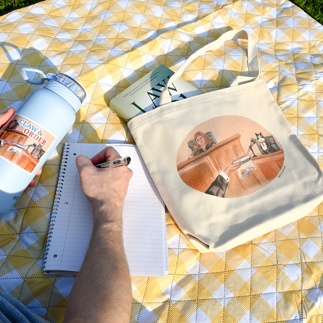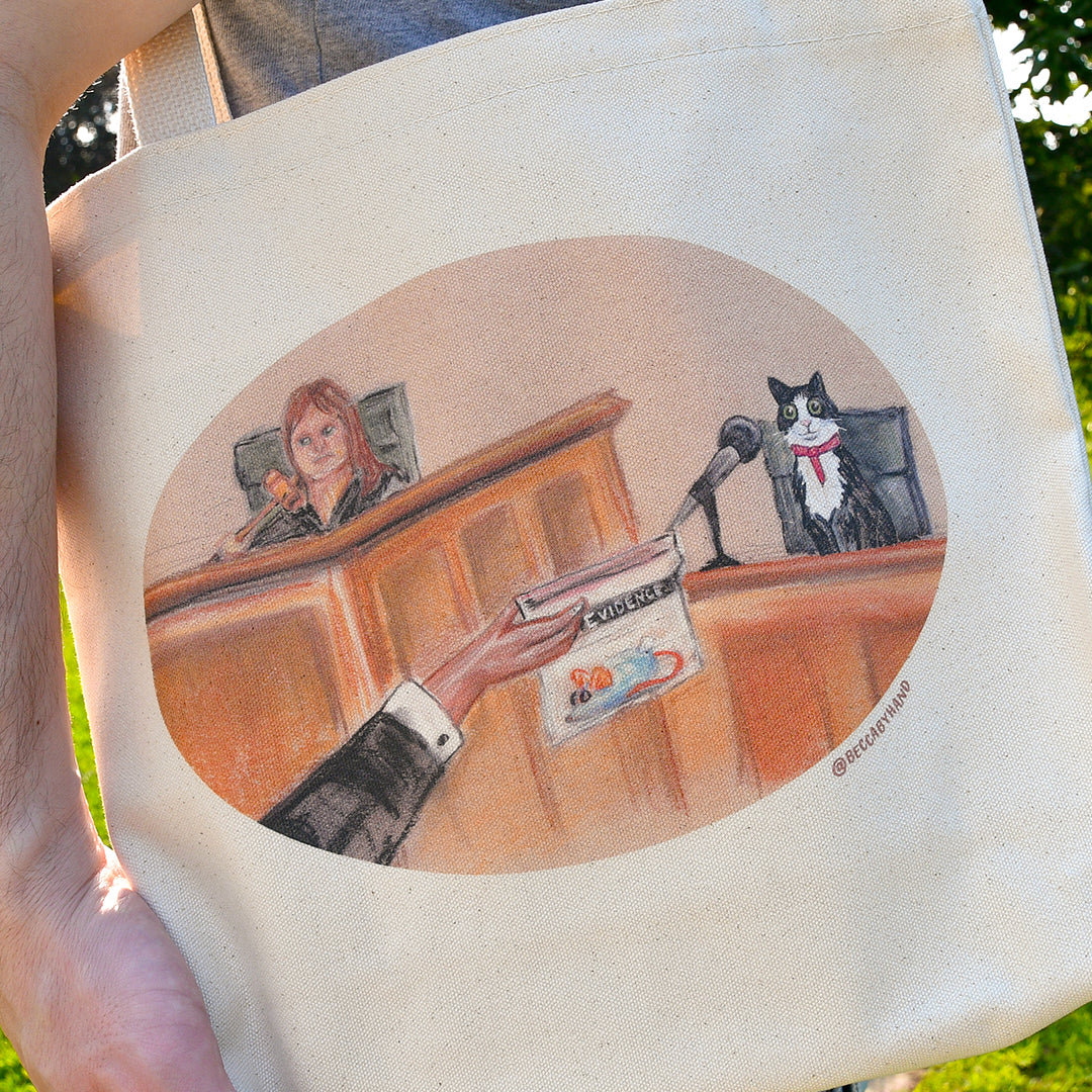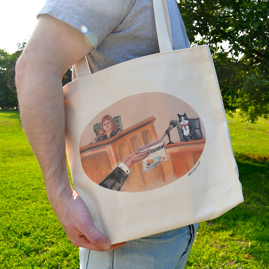 My hand-drawn courtroom sketch of a cat on trial, heat-transferred on a durable, high-quality cotton tote bag.
