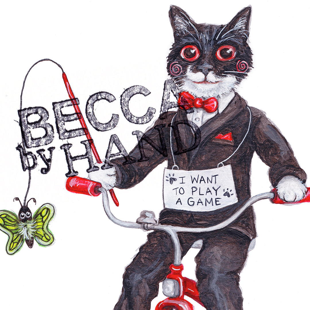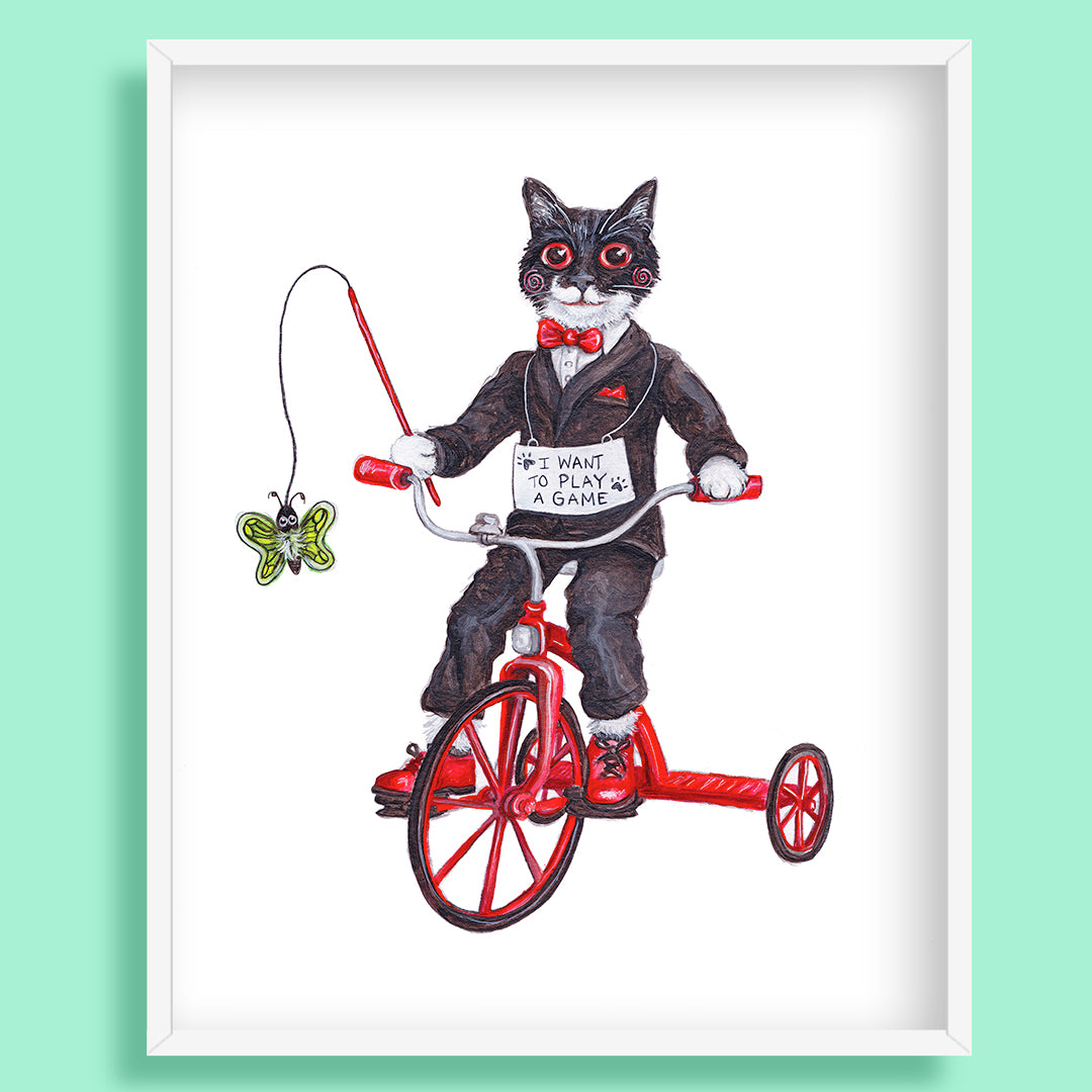 Jigpaw wants to play a game... that may include catnip toys and lasers. This is a perfect piece of artwork for fans of the Saw franchise and cats.