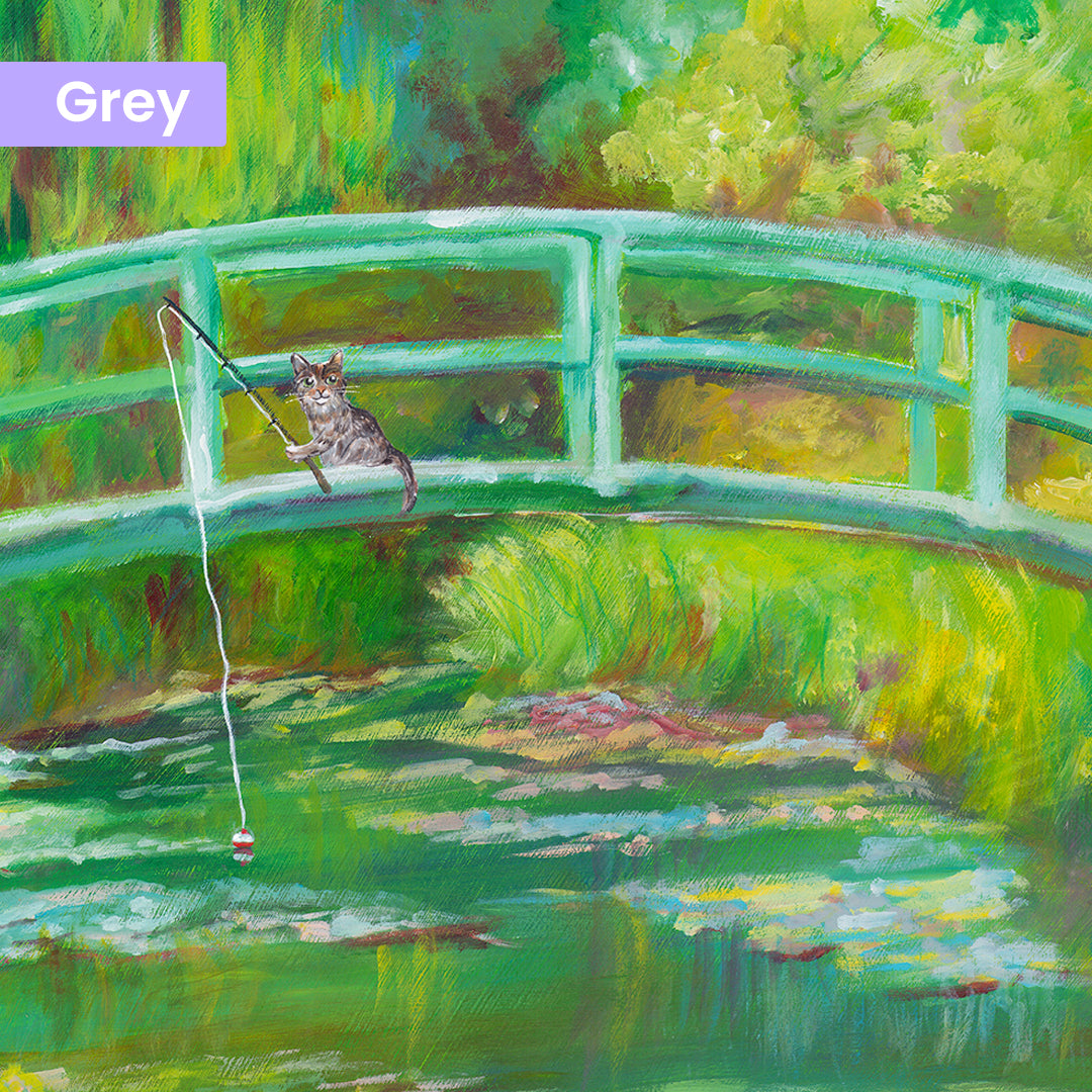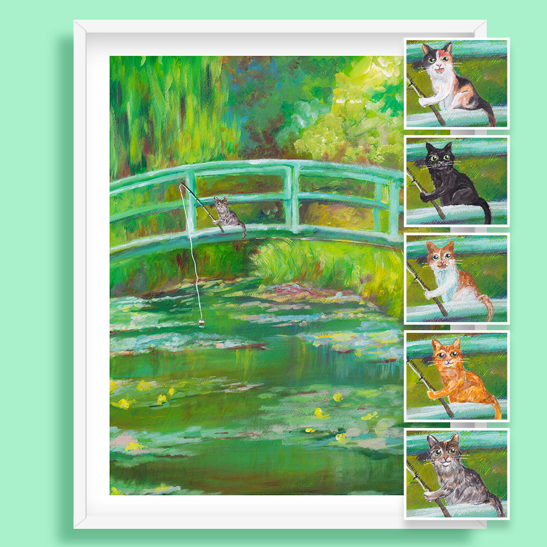 An impressionist recreation of Claude Monet's Water Lily Pond painting with one added bonus: a cat fishing off the bridge.