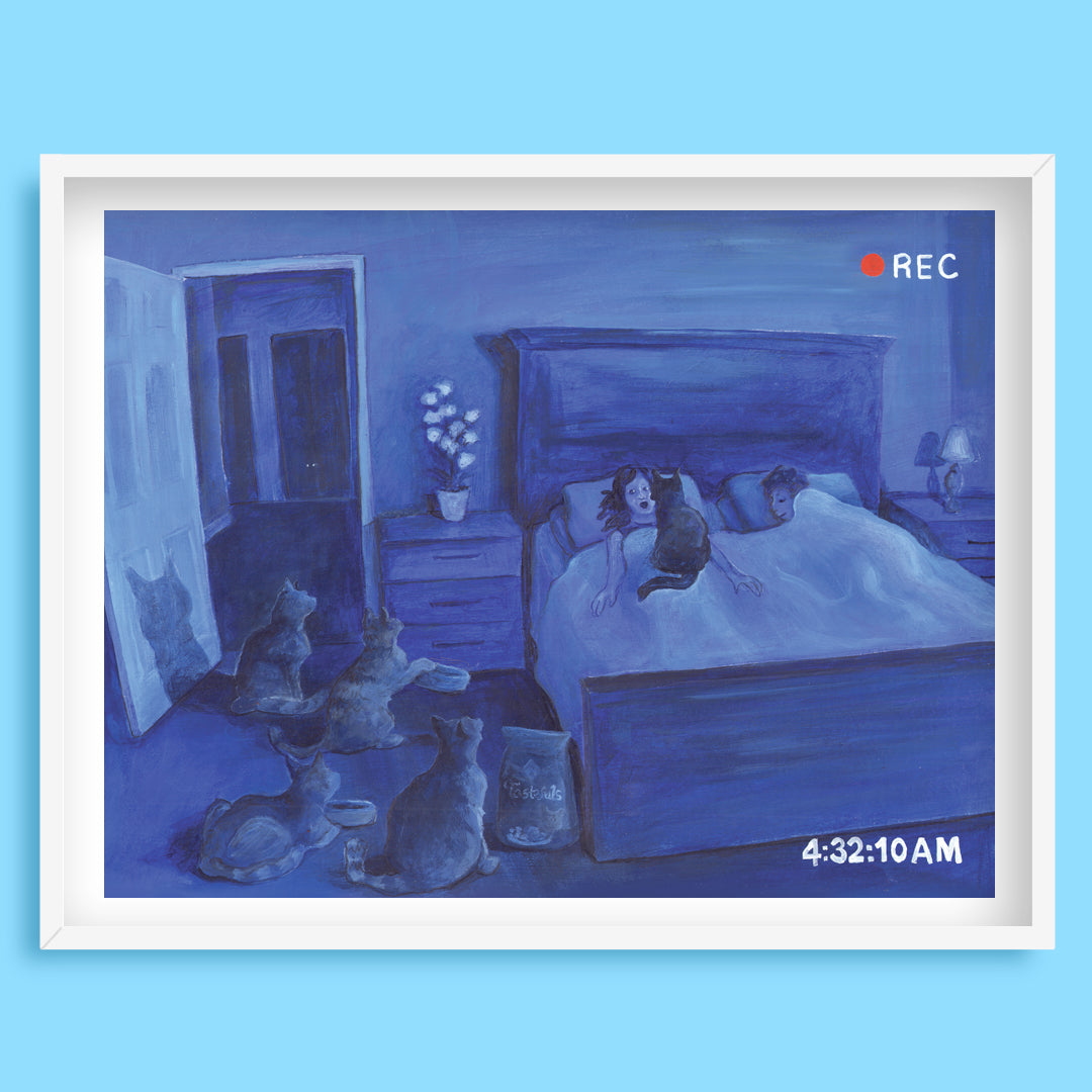 This painting is from my ongoing Scaredy Cats series, available as prints, coloring books, stickers, calendars, and more in my shop!